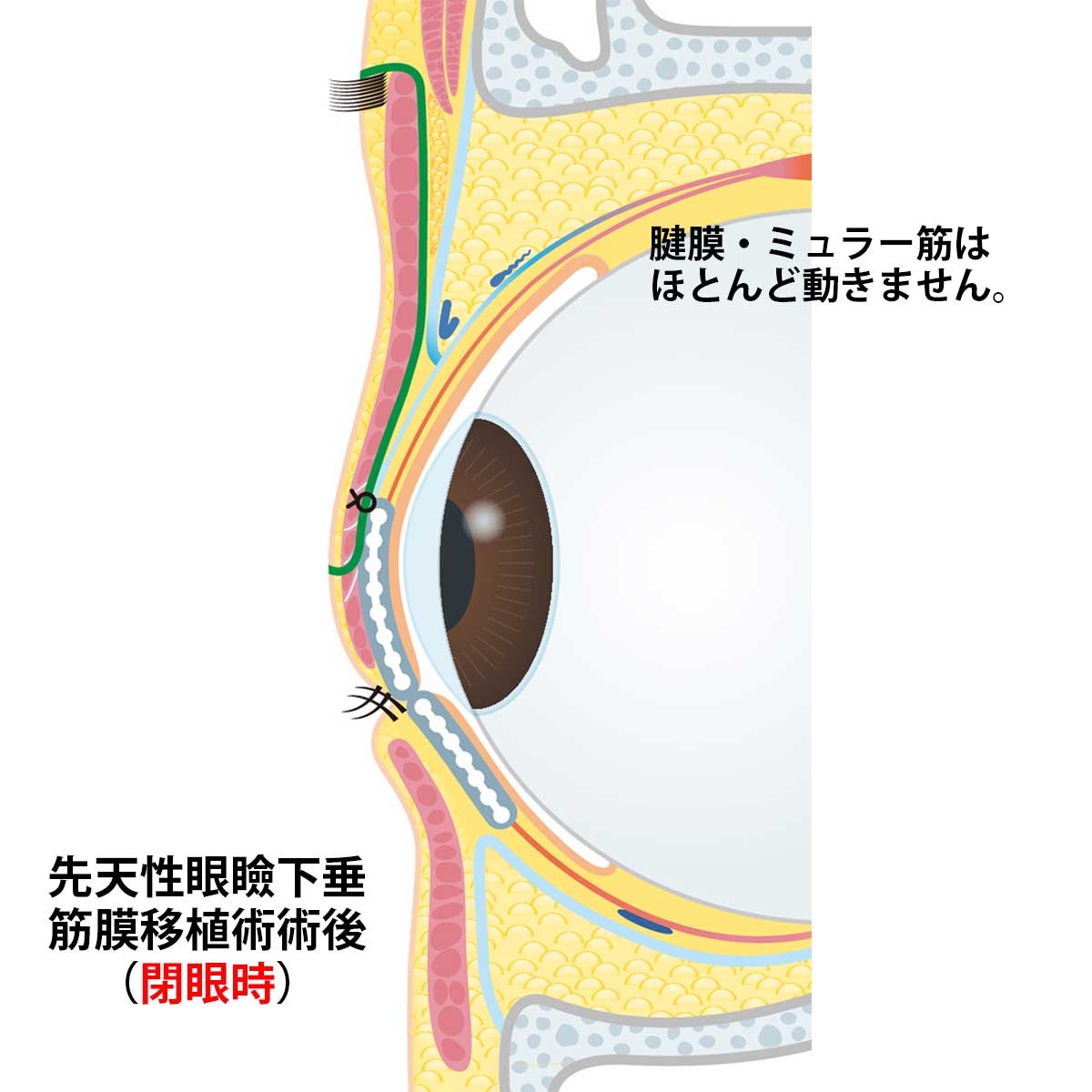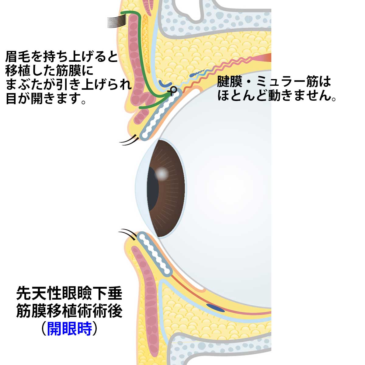 しかし、この術式も完璧なものではなく、残念なこともあります。前頭筋でまぶたを上げることになるため、必然と言えば必然ですがおでこのシワは残ります。筋膜移植術を行うと下を見る際どうしても上三白眼となってしまいます。通常は足元など下を見る時はまぶたも下がり瞳の上の白い部分を覆い隠しますが、筋膜移植をして前頭筋で眼瞼を引っ張っていると眼瞼が上がったまま目玉(眼球)だけが下を向いてしまいます。少し奇妙な風貌となってしまいますが、視野を確保するためには仕方のないことなのです。