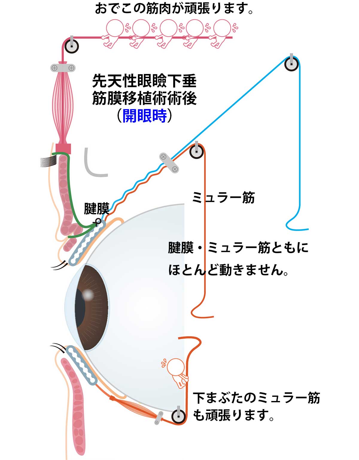 こうすることで代償性に動く前頭筋の力が筋膜を通じて存分に眼瞼に伝わるので、目が楽に開くようになります。眉毛を上げれば上げるだけ、おでこを動かせば動かすだけ目を開くことができるようになります。図に表すとこんなところだと思います。