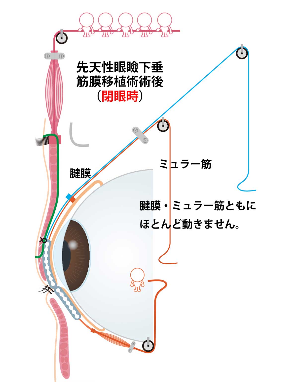 このタイプの眼瞼下垂症の手術では、動かない眼瞼挙筋の代わりに眼瞼を持ち上げる別の動力源が必要になり、その代表的な手術は